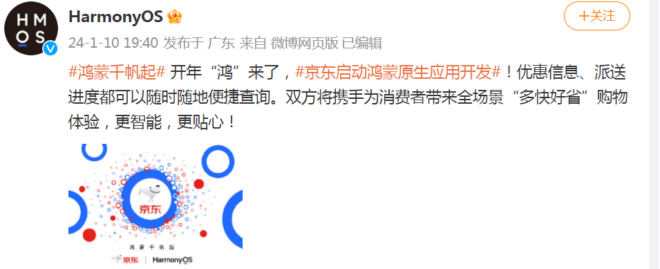 1月10日晚,HarmonyOS微博發(fā)文稱:京東啟動(dòng)鴻蒙原生應(yīng)用開發(fā),雙方將攜手為消費(fèi)者帶來全場景“多快好省”購物體驗(yàn),更智能,更貼心。
