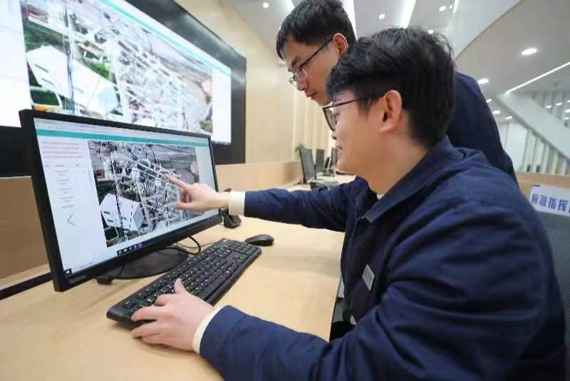 國(guó)網(wǎng)天津城南供電公司供電服務(wù)指揮人員利用“全景保供電場(chǎng)景”監(jiān)測(cè)設(shè)備運(yùn)行狀態(tài)。