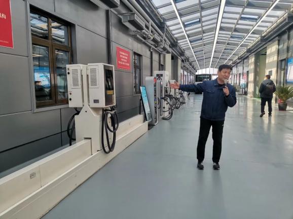 在公交車智能機(jī)器人充電區(qū)域,有關(guān)技術(shù)人員向記者介紹新型自動化充電裝置。