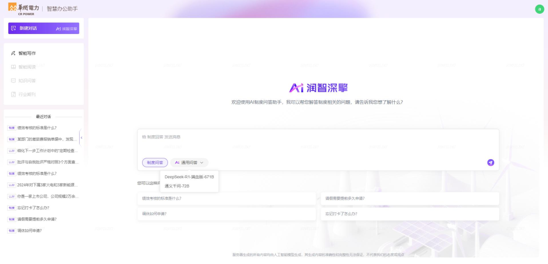 華潤電力正在快速推進(jìn)智慧辦公助手建設(shè),計(jì)劃今年上半年完成智能寫作、行業(yè)期刊等模塊建設(shè)。