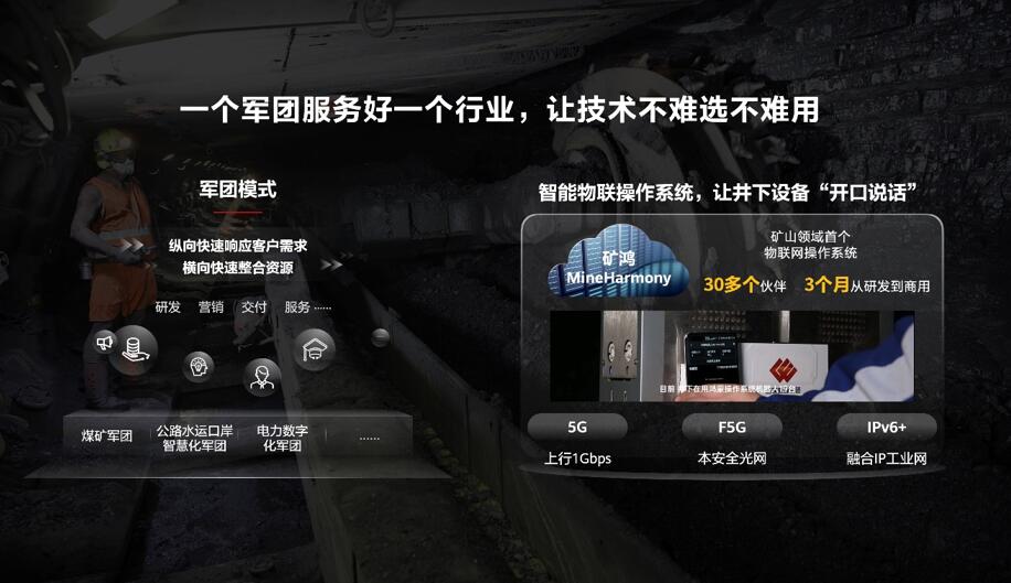 為了幫助企業(yè)選好技術(shù)、用好技術(shù),另一個關(guān)鍵措施就是成立軍團。自去年底,我們已面向煤礦、港口、電力等多個行業(yè)成立了多個軍團組織。軍團是專業(yè)化隊伍,一方面,對內(nèi)拉通端到端的資源,包括研發(fā)、銷售、交付、服務(wù)等,以便深入理解行業(yè)的生產(chǎn)實踐和行業(yè)知識,打造適配場景的產(chǎn)品和解決方案;另一方面,對外聯(lián)合更多的解決方案伙伴,把華為和伙伴的能力整合在一起,形成針對性的解決方案。