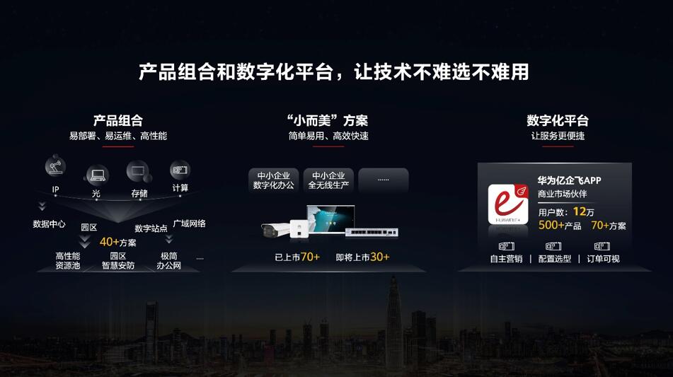今年,我們已經(jīng)面向金融、教育、醫(yī)療、能源等行業(yè),推出了40多個產(chǎn)品組合方案,比如園區(qū)智慧安防、極簡辦公網(wǎng)等,覆蓋數(shù)據(jù)中心、園區(qū)、數(shù)字站點、廣域網(wǎng)絡(luò)等場景,基本上可滿足企業(yè)數(shù)字化轉(zhuǎn)型中90%的數(shù)字基礎(chǔ)設(shè)施需求。