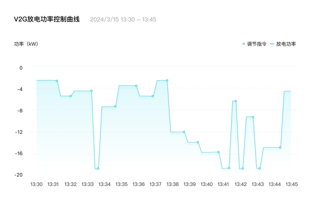 本次試驗設(shè)備采用廣汽能源20kW一體式V2G充電樁及昊鉑HT車型,試驗中,廣汽能源智慧管理云平臺模擬接收電網(wǎng)調(diào)控中心(虛擬電廠)的調(diào)頻指令,然后通過ADR技術(shù)連續(xù)15分鐘自動控制V2G充電及放電功率,秒級響應(yīng)虛擬電廠的調(diào)頻需求。