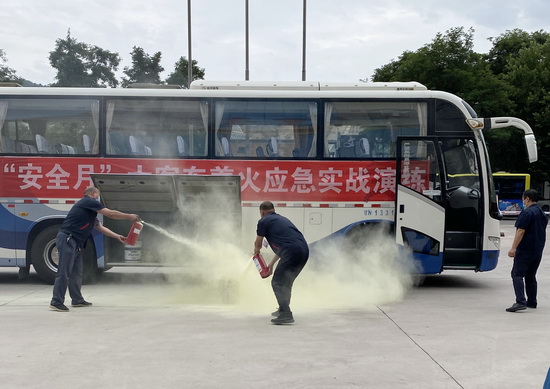 在演練時(shí),隨著滿載乘客的大客車(chē)行駛至劉電賓館門(mén)前,突然行李艙起火,大客車(chē)駕駛員在突然遇火險(xiǎn)緊急情況下,立即開(kāi)啟應(yīng)急雙閃燈,靠邊停車(chē),打開(kāi)車(chē)門(mén),迅速引導(dǎo)車(chē)內(nèi)乘客有序疏散,并要求大家用濕毛巾捂住口鼻,彎腰依次撤離到車(chē)外安全地帶。緊接著滅火組演練人員迅速行動(dòng)起來(lái),熟練地取出車(chē)載滅火器,拔下滅火器安全銷(xiāo),用噴口對(duì)準(zhǔn)火源根部,及時(shí)將火撲滅,救護(hù)組及時(shí)疏散和救援下車(chē)人員,并對(duì)傷員身體狀況進(jìn)行基本護(hù)理和檢查。整個(gè)演練過(guò)程既緊張,又有條不紊,進(jìn)一步增強(qiáng)了全體員工的安全意識(shí),真正掌握了交通工具突發(fā)火險(xiǎn)后迅速逃生、自救、互救的基本方法,達(dá)到了演練的預(yù)期目的。
