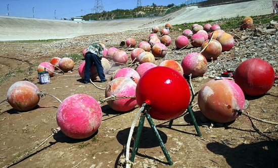 劉家峽水電廠壩前浮球阻攔系統(tǒng)是為防止船舶或人員靠近泄水區(qū)域發(fā)生意外事故而設(shè)置的安全防護(hù)設(shè)施和安全標(biāo)識,主要由浮球、浮箱、滑道、塔架、圍欄及連接鋼絲繩等部件組成。這次維修主要是對2019年汛后檢查中發(fā)現(xiàn)的30個已損壞下沉浮球、連接浮球的繩卡進(jìn)行維修,對浮箱、鋼塔架和滑道等進(jìn)行防腐處理以恢復(fù)其功能。