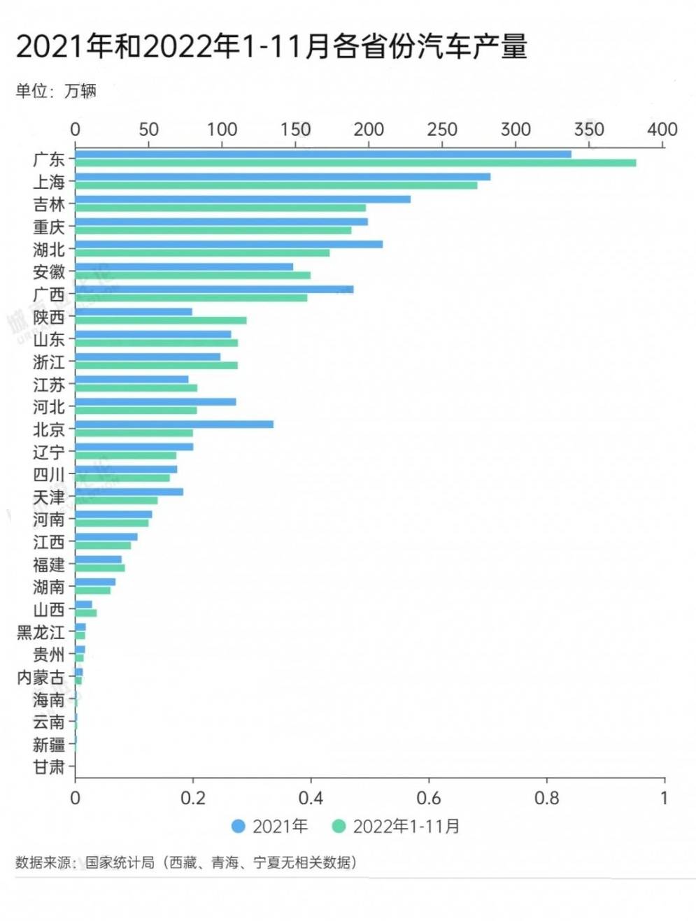 不僅如此,根據(jù)國家統(tǒng)計局公布的2022年1-11月汽車產(chǎn)量數(shù)據(jù),湖北(173.77萬輛)已被重慶(188.55萬輛)超越,退居第五位。