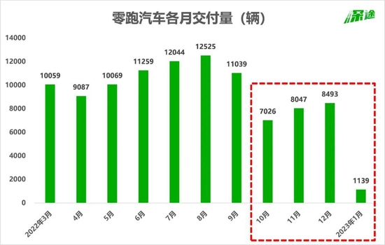 比較讓人意外的是零跑。1月只交付了1139輛,而去年12月是8493輛,環(huán)比下跌幅度達(dá)到87%。零跑現(xiàn)在是明顯的后勁不足,去年有連續(xù)5個(gè)月交付過(guò)萬(wàn),從10月開(kāi)始掉到七八千的水平。1月的成績(jī)用“撲街”來(lái)形容再合適不過(guò)了。