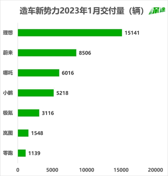 總體來(lái)說(shuō),1月的成績(jī)不算好。除了理想交付了15141輛,其他各家都沒(méi)過(guò)萬(wàn),零跑更是只交付了1139輛。1月的交付量排名如下圖: