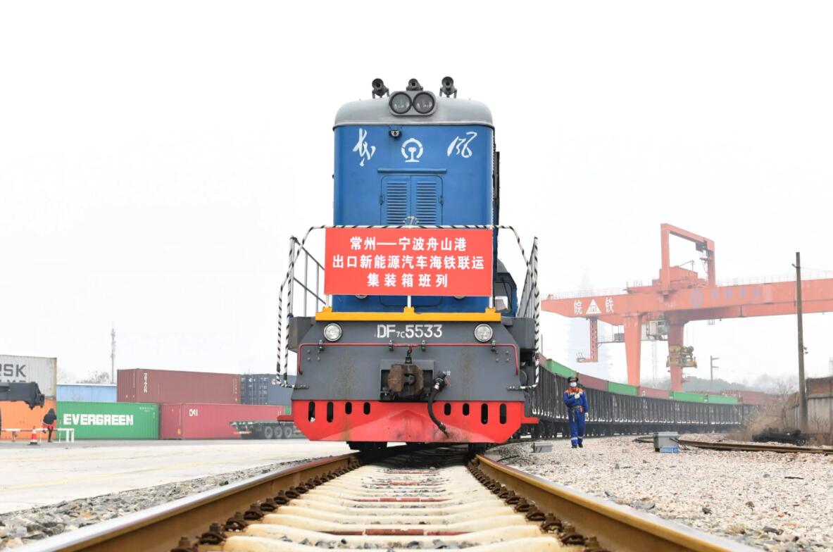 2月8日,在常州站鐵路貨場,裝載新能源汽車的海鐵聯(lián)運鐵路班列即將發(fā)車。新華社發(fā)(史康 攝)