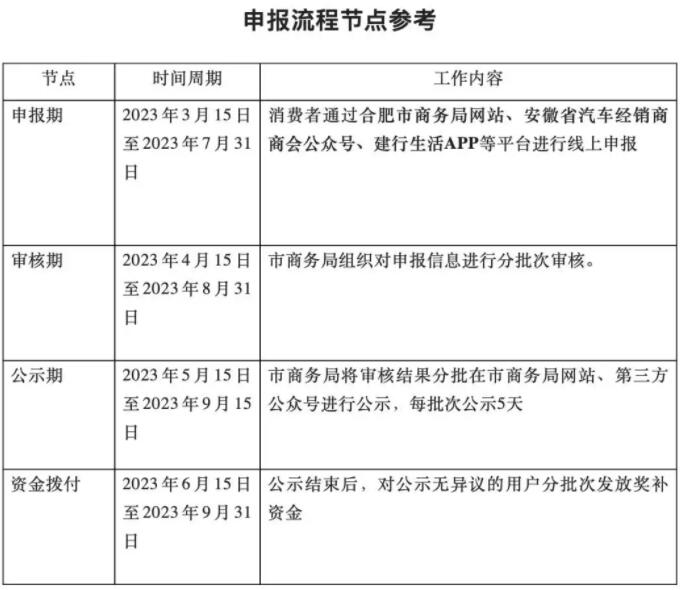 補貼申請須由個人用戶發(fā)起。申請人可以通過個人登錄合肥市商務局網(wǎng)站、合肥發(fā)布等查看申報通知和申報入口,申報期自2023年3月15日至7月31日,具體申報信息以市商務局網(wǎng)站等公告為準,須提交以下信息: