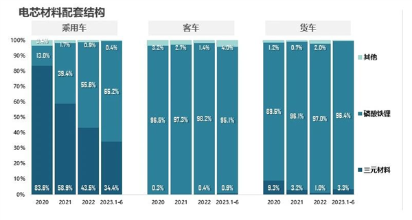 2023年1-6月, 乘用車領(lǐng)域,磷酸鐵鋰電芯配套率達(dá)65.2%,而商用車領(lǐng)域中基本已完成了對(duì)其他材料電芯的替代。