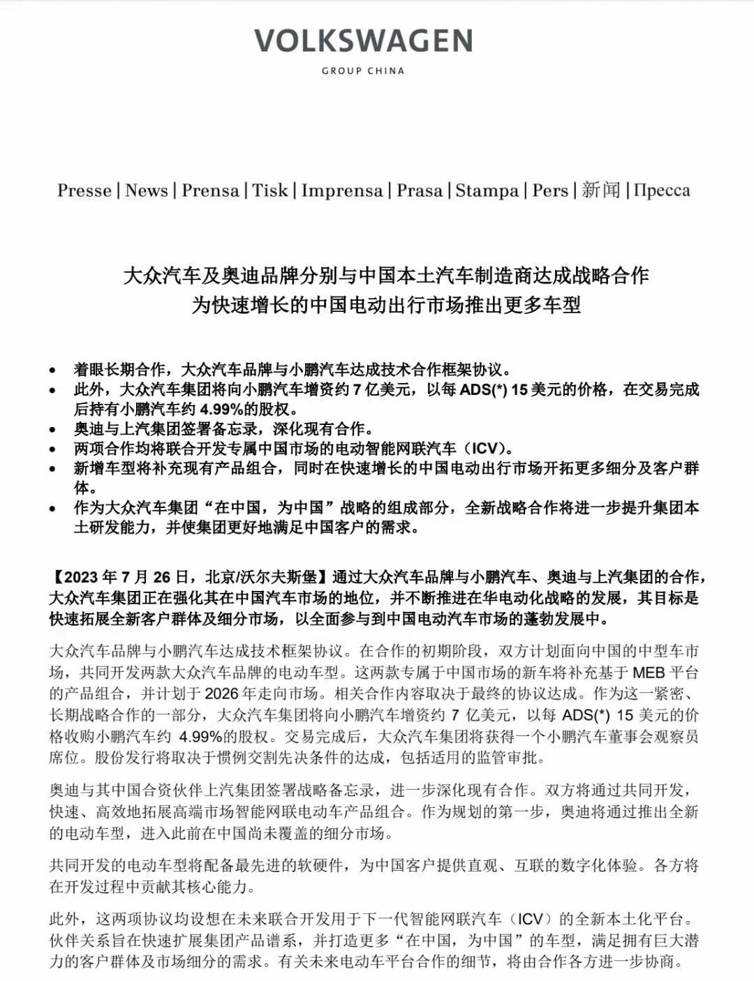 在新車“上市即熱銷”的同時,小鵬還曝出了另一條讓所有人都出乎意料的“大新聞”——7月26日,該品牌與大眾汽車同時宣布:雙方已達成技術(shù)框架協(xié)議,將面向中國的中型車市場,共同開發(fā)兩款大眾汽車品牌的電動車型,并計劃于2026年推向市場。