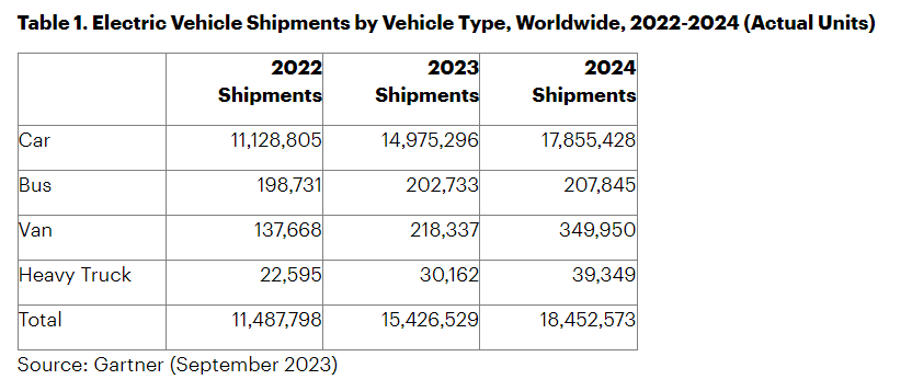 Gartner 表示如果計(jì)算汽車、巴士、貨車和重型卡車在內(nèi),所有電動(dòng)類型的汽車出貨量為 1542 萬輛;明年將達(dá)到 1845 萬輛。