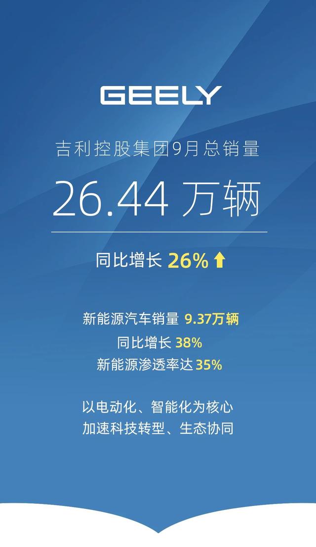 從吉利控股集團(tuán)官方公告獲悉,吉利控股集團(tuán) 9 月汽車總銷量 26.44 萬輛,同比增長 26%。新能源汽車銷量 9.37 萬輛,同比增長 38%,新能源滲透率為 35%。