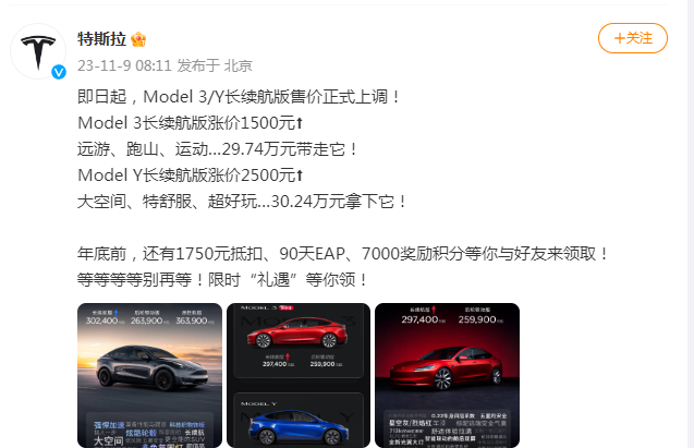 11月9日,特斯拉官方微博發(fā)布消息,即日起,Model 3/Y長續(xù)航版售價(jià)正式上調(diào),Model 3長續(xù)航版漲價(jià)1500元至29.74萬元。Model Y長續(xù)航版漲價(jià)2500元至30.24萬元。