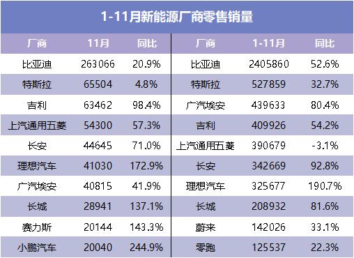 具體到細分品牌,新能源汽車今年前11個月銷量排名前三的品牌分別是比亞迪、特斯拉和廣汽埃安。