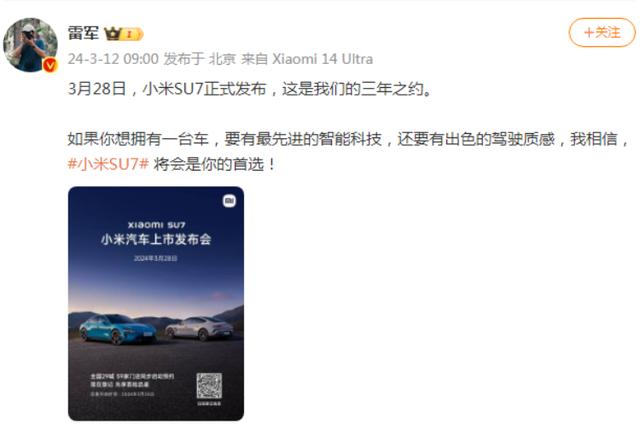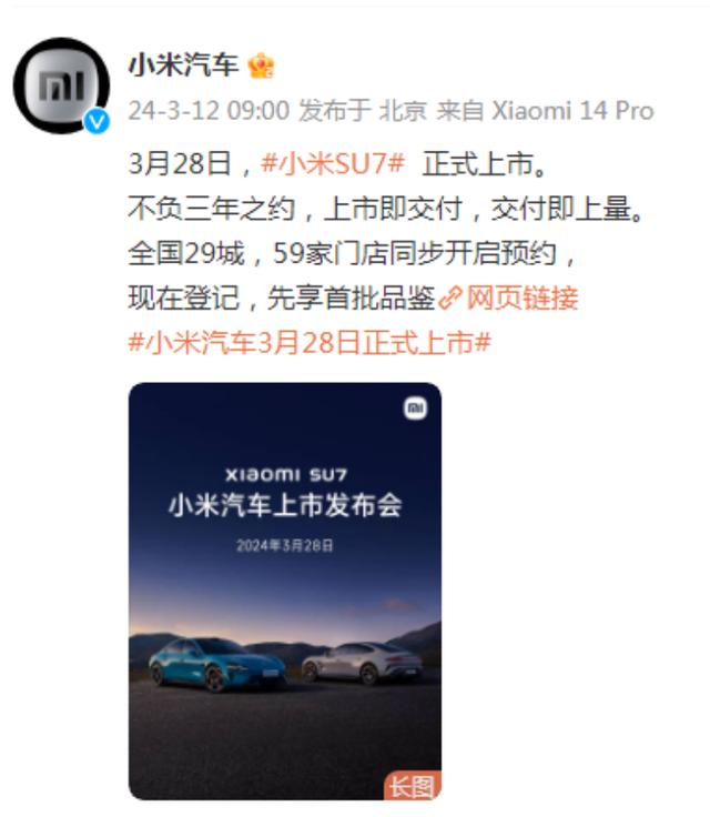 3月12日,雷軍發(fā)布微博稱,“3月28日,小米SU7正式發(fā)布,這是我們的三年之約。”小米汽車官方微博同時宣布小米SU7將于3月28日正式上市并交付,并在全國59家門店同步開啟預(yù)約。
