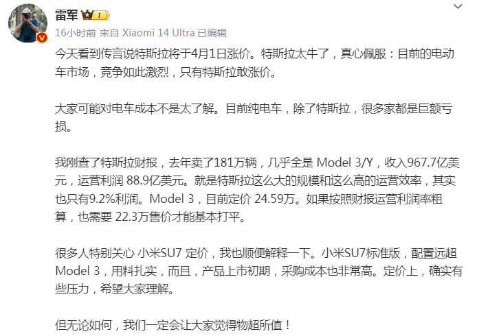 雷軍還提到了小米SU7的定價,他表示:“小米SU7標(biāo)準(zhǔn)版,配置遠超 Model 3,用料扎實,而且,產(chǎn)品上市初期,采購成本也非常高。定價上,確實有些壓力,希望大家理解。”