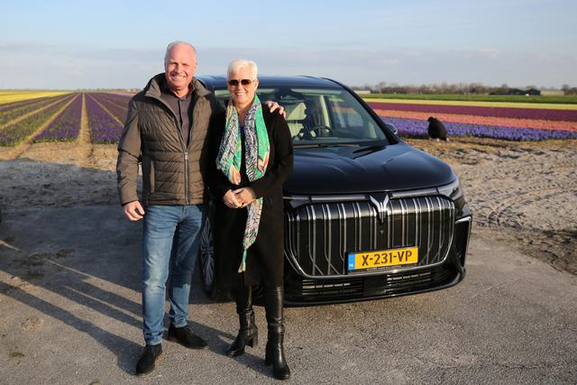3月25日,荷蘭消費(fèi)者埃里克·贊德貝亨和他的妻子埃倫在嵐圖汽車(chē)前合影。新華社記者趙丁喆攝