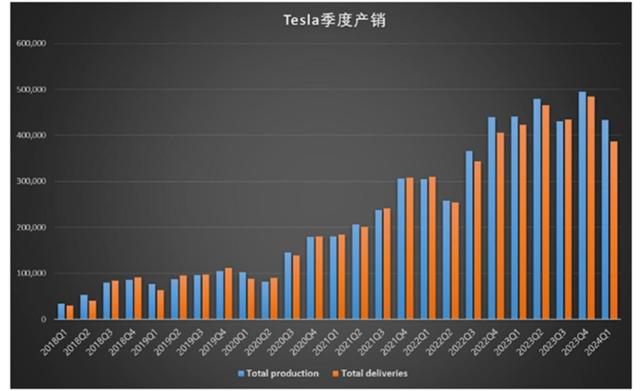 今年一季度,特斯拉的全球交付量為38.7萬(wàn)輛,同比下降8.5%,環(huán)比下降20.2%;全球產(chǎn)量為43.3萬(wàn)輛,同比下降1.7%,環(huán)比下降12.4%,這是特斯拉歷史上首次產(chǎn)銷(xiāo)量出現(xiàn)同比和環(huán)比的雙雙下降。