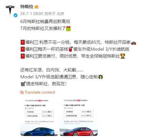 7月31日前,針對Model 3/Y標(biāo)準(zhǔn)續(xù)航版推出的1~5年0息和低息優(yōu)惠購車政策,日供低至85元起;針對Model 3/Y長續(xù)航全輪驅(qū)動版推出的1~5年0息和低息購車優(yōu)惠政策,日供低至107元起;特斯拉將7月限時(shí)低息的年費(fèi)率降至0.5%起(折合年化利率0.93%起)。