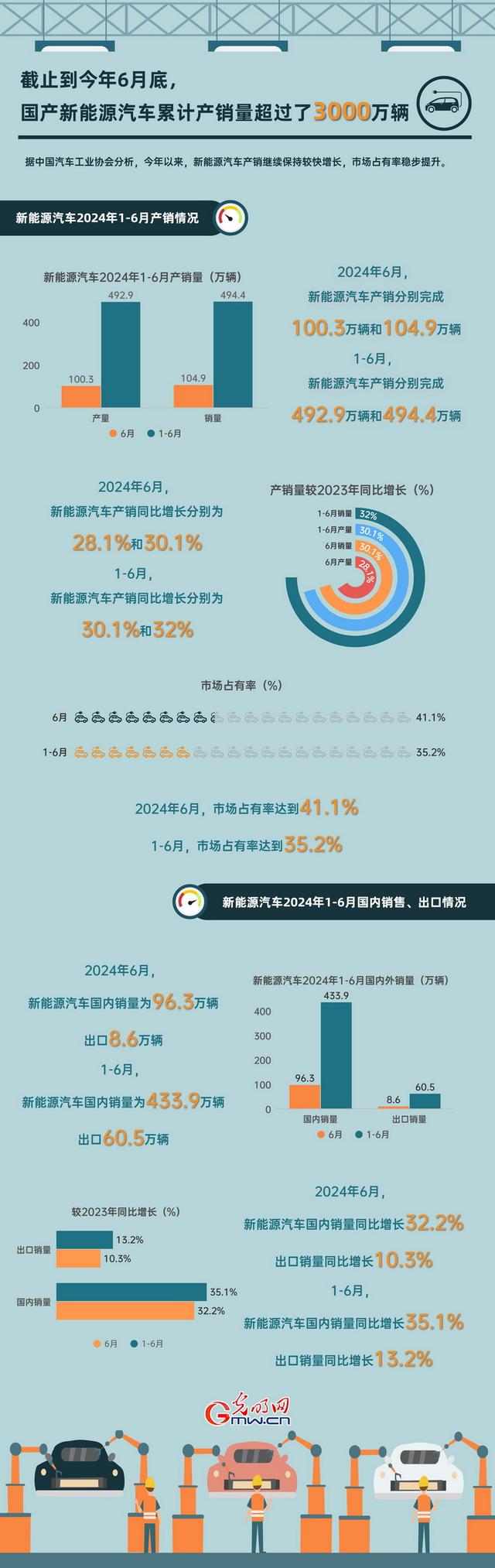 據(jù)中國汽車工業(yè)協(xié)會發(fā)布的數(shù)據(jù)顯示,2024年6月,新能源汽車產(chǎn)銷分別完成100.3萬輛和104.9萬輛,同比分別增長28.1%和30.1%,市場占有率達(dá)到41.1%。1-6月,新能源汽車產(chǎn)銷分別完成492.9萬輛和494.4萬輛,同比分別增長30.1%和32%,市場占有率達(dá)到35.2%。