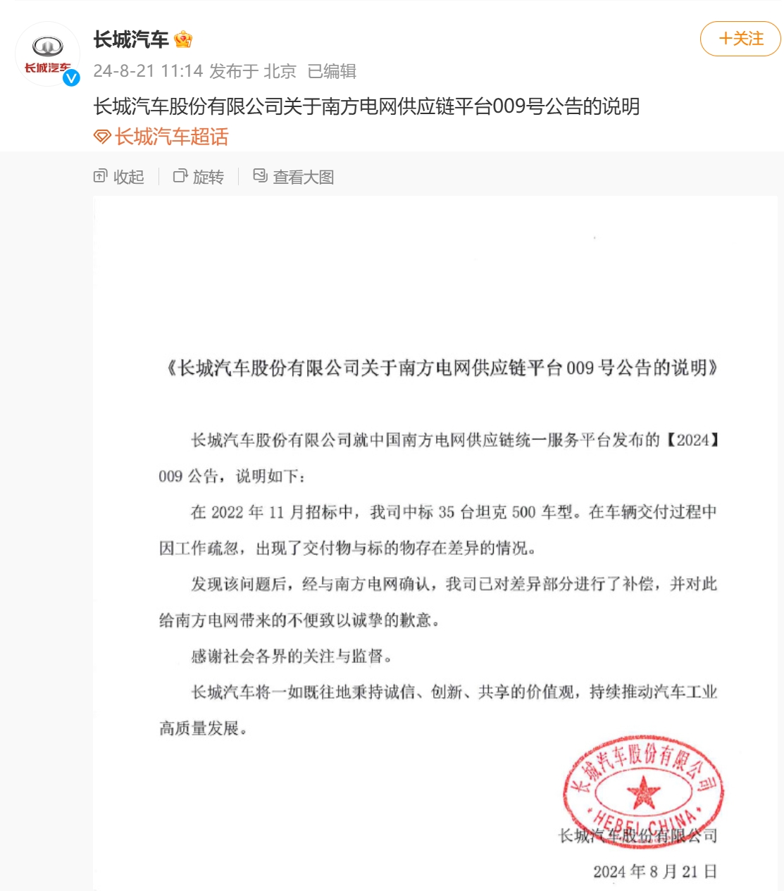 8月21日,長城汽車發(fā)布關(guān)于南方電網(wǎng)供應(yīng)鏈平臺009號公告的說明。長城汽車稱,在2022年11月招標(biāo)中,長城汽車中標(biāo)35臺坦克500車型。在車輛交付過程中因工作疏忽,出現(xiàn)了交付物與標(biāo)的物存在差異的情況。發(fā)現(xiàn)該問題后,經(jīng)與南方電網(wǎng)確認(rèn),長城汽車已對差異部分進(jìn)行了補(bǔ)償,并對此給南方電網(wǎng)帶來的不便致以誠摯的歉意。此前,根據(jù)南方電網(wǎng)發(fā)布的供應(yīng)商處理公告,長城汽車被南方電網(wǎng)列為“不接受投標(biāo)”的供應(yīng)商。