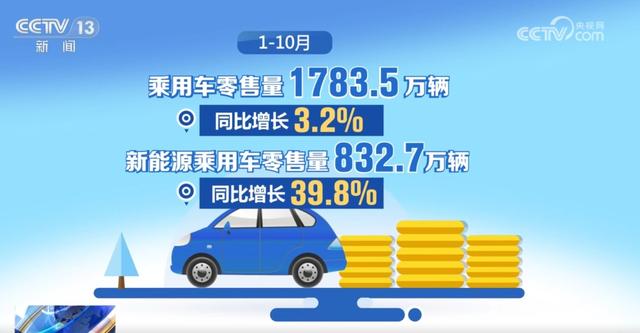 在以舊換新政策的帶動(dòng)下,汽車銷量也有了明顯增長(zhǎng)。10月份,乘用車零售量226.1萬(wàn)輛,同比增長(zhǎng)11.3%,增速較9月加快6.8個(gè)百分點(diǎn)。其中,新能源乘用車零售量119.6萬(wàn)輛,同比增長(zhǎng)56.7%,增速較9月加快5.8個(gè)百分點(diǎn),占乘用車零售量的比重達(dá)52.9%。1—10月,乘用車零售量1783.5萬(wàn)輛,同比增長(zhǎng)3.2%。其中,新能源乘用車零售量832.7萬(wàn)輛,同比增長(zhǎng)39.8%。(央視網(wǎng))