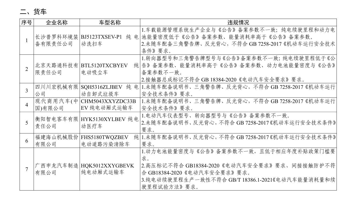 (二)新能源貨車,共涉及7家企業(yè)的7個(gè)車型產(chǎn)品,涉及零部件參數(shù)與《公告》備案參數(shù)不一致、高壓標(biāo)記不符合標(biāo)準(zhǔn)要求等問(wèn)題。
