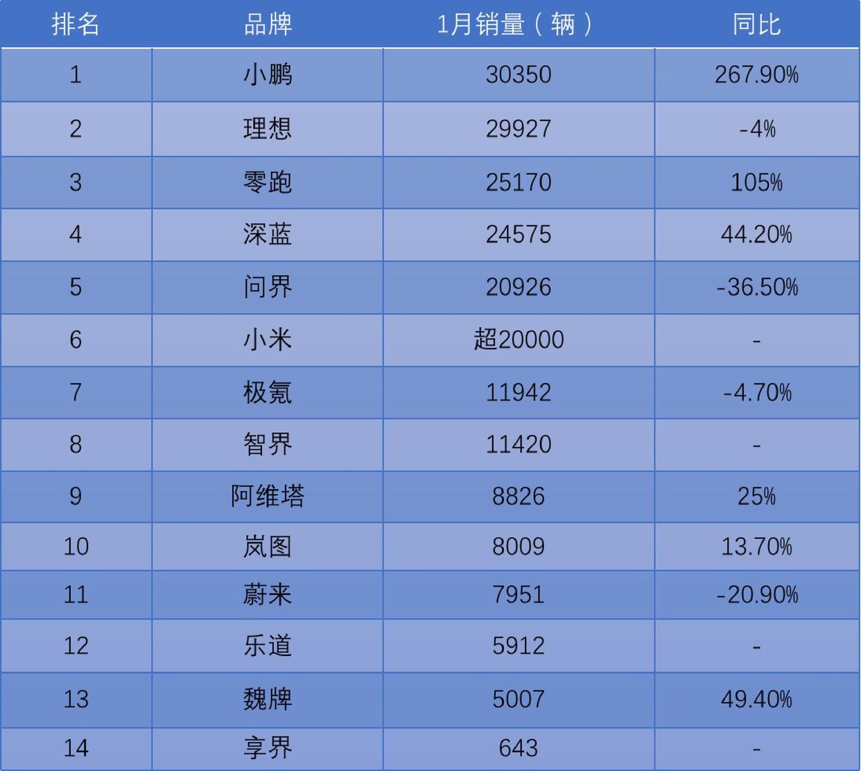 但仍有企業(yè)實(shí)現(xiàn)銷量“開門紅”,其中小鵬汽車、奇瑞汽車(新能源)、零跑汽車1月銷量增長率均突破100%。小鵬汽車更是以268%的增長率,時(shí)隔30個(gè)月后再次登頂新造車企業(yè)銷量排行榜。同時(shí),小米汽車以月銷超2萬輛首次超越了蔚來。