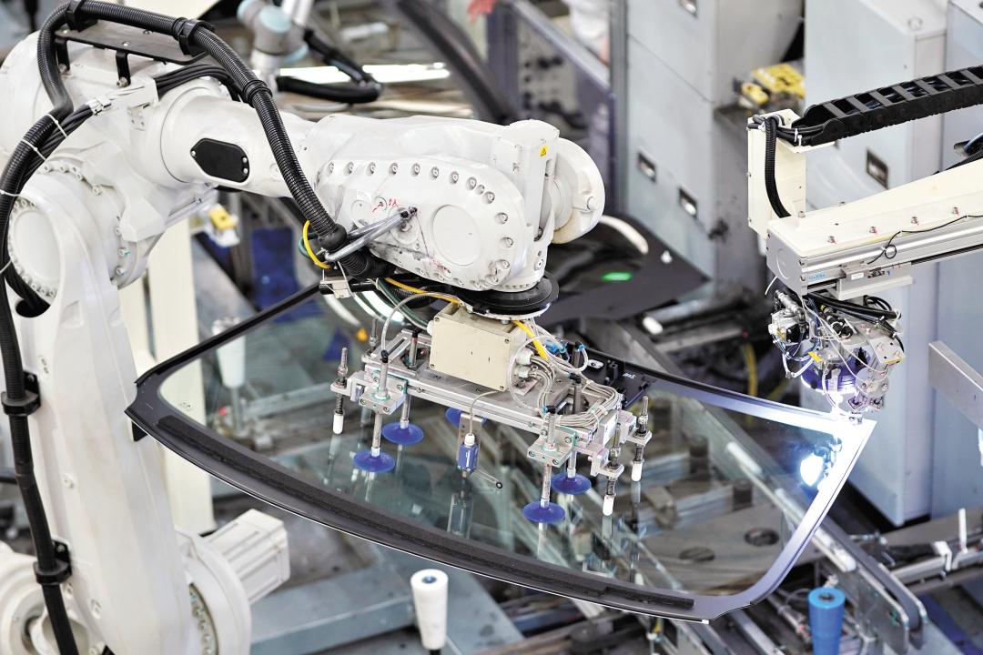 前后擋風玻璃安裝站是一個多機器人融合的工位。