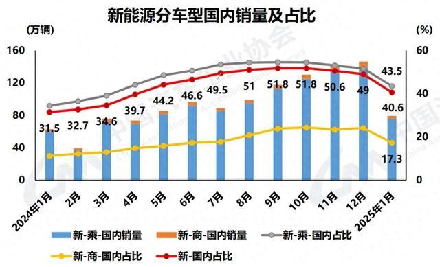 中汽協(xié)最新數(shù)據(jù)顯示,2025年1月,新能源乘用車國內銷量占乘用車國內銷量比例為43.5%,這一比例已經(jīng)連續(xù)4個月環(huán)比下跌,也是在去年9月達到最高點后,第二個月跌至50%以下。去年9月,國內新能源乘用車滲透率達到歷史最高點,為54.5%。