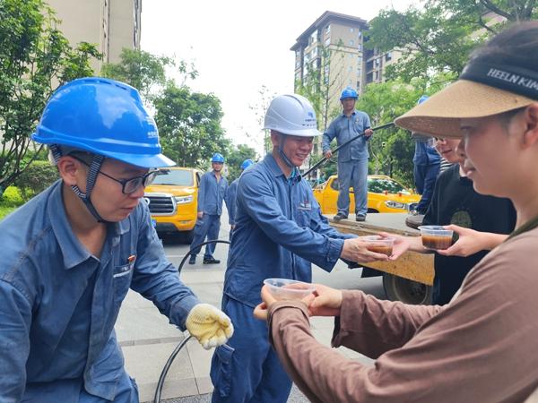 6月22日,桂林市萬(wàn)達(dá)翰林府小區(qū)群眾為正在開展搶修復(fù)電的南方電網(wǎng)廣西欽州靈山供電局黨員突擊隊(duì)員們送上綠豆湯。陳心誠(chéng)攝