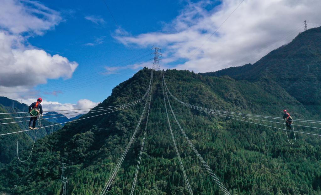 新華社成都10月21日電(記者張海磊、高博楊、王曦)負(fù)重20多斤,在距離地面100多米的銀白色導(dǎo)線上,克服導(dǎo)線晃動,走線檢修……在四川省雅安市天全縣喇叭河鎮(zhèn),國網(wǎng)四川電力送變電建設(shè)有限公司輸電二公司的巡檢人員羅正雄和同事們正克服雨水多、時間緊、高海拔山區(qū)高空作業(yè)風(fēng)險大等困難,抓緊開展電力高空作業(yè)。