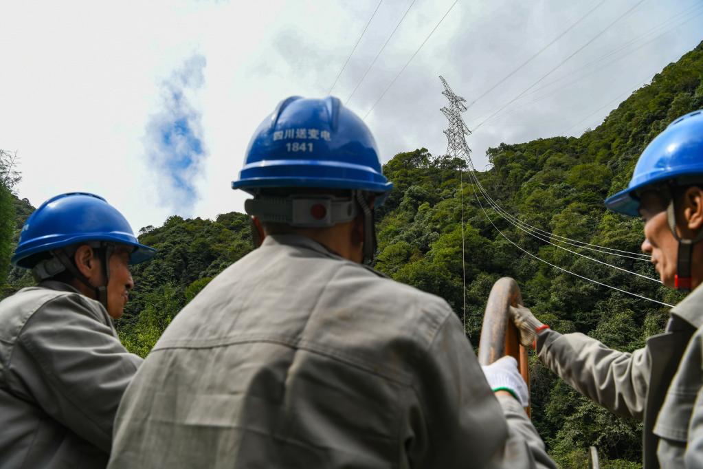 10月18日,在四川省雅安市天全縣喇叭河鎮(zhèn),技術(shù)人員在操作駐架車回卷三級導(dǎo)引繩。新華社記者 王曦 攝
