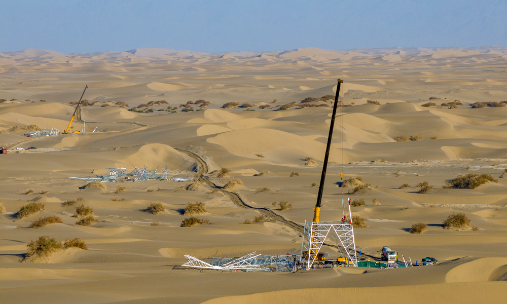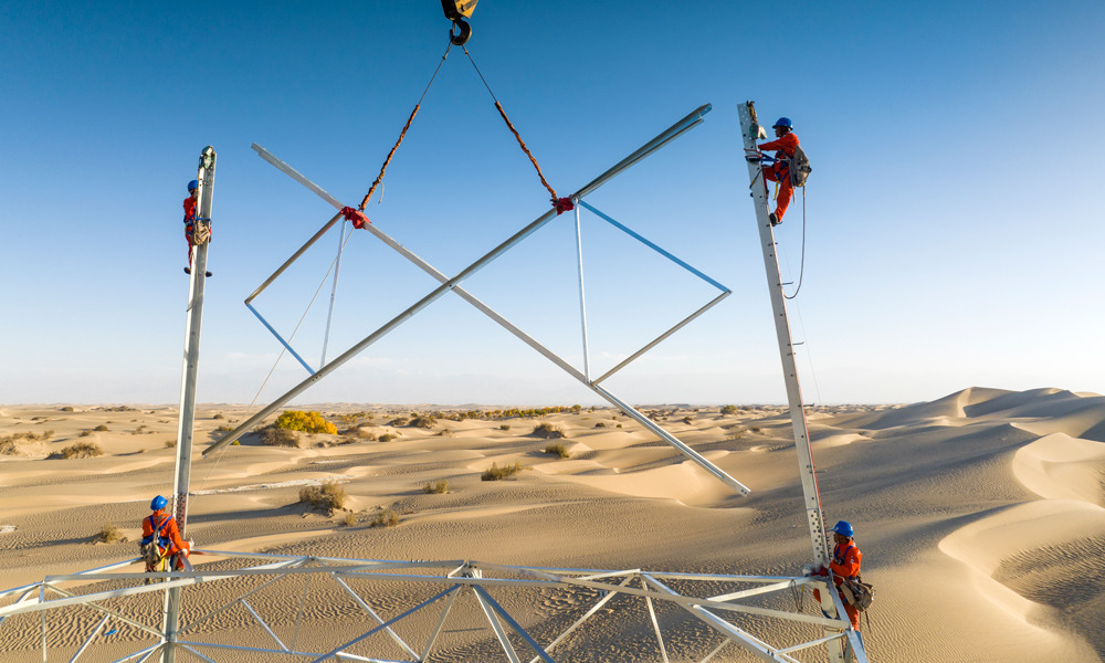 近日,山東送變電工程有限公司施工人員開展新疆750千伏且末—若羌輸電線路工程Ⅱ標段鐵塔組立作業(yè)。該標段線路長110.85千米,全線位于塔克拉瑪干沙漠,共計新建鐵塔225基。