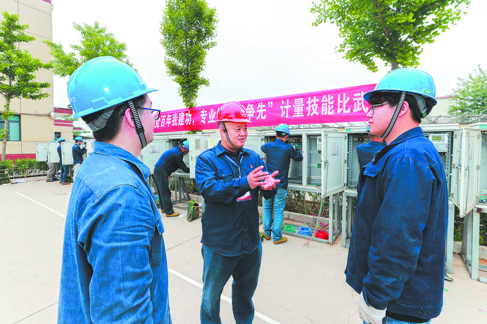 張遠(yuǎn)平(左)在計(jì)量專業(yè)技能比武活動(dòng)現(xiàn)場(chǎng),向選手講解裝表接電技術(shù)要點(diǎn)。黃曉東 攝