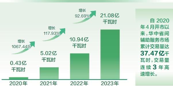 華中省間電力輔助服務(wù)市場交易量(省間調(diào)峰輔助服務(wù)交易量+省間備用輔助服務(wù)交易量)連續(xù)3年高速增長。2020年、2021年、2022年、2023年交易量分別為0.43億、5.02億、10.94億、21.08億千瓦時,2021、2022、2023年交易量分別同比增長1067.44%、117.93%、92.69%。自2020年4月開市以來,市場累計交易量達37.47億千瓦時。