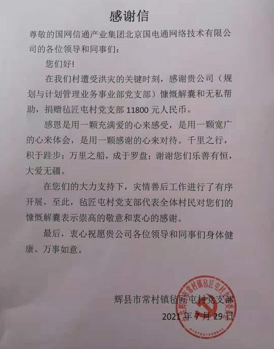 中國(guó)電力網(wǎng)訊 (通訊員 朱友宇) “在您們的大力支持下,災(zāi)情善后工作進(jìn)行了有序開(kāi)展,至此,氈匠屯村黨支部代表全體村民對(duì)您們的慷慨解囊表示崇高的敬意和衷心的感謝”,輝縣市常村鎮(zhèn)氈匠屯村黨支部在感謝信中寫(xiě)道。7月29日,國(guó)網(wǎng)信通產(chǎn)業(yè)集團(tuán)國(guó)電通規(guī)劃與計(jì)劃管理業(yè)務(wù)事業(yè)部黨支部收到了一封特殊的感謝信,這封信不是來(lái)自用戶(hù)的,也不是來(lái)自上級(jí)單位的,它來(lái)自輝縣市常村鎮(zhèn)氈匠屯村黨支部。