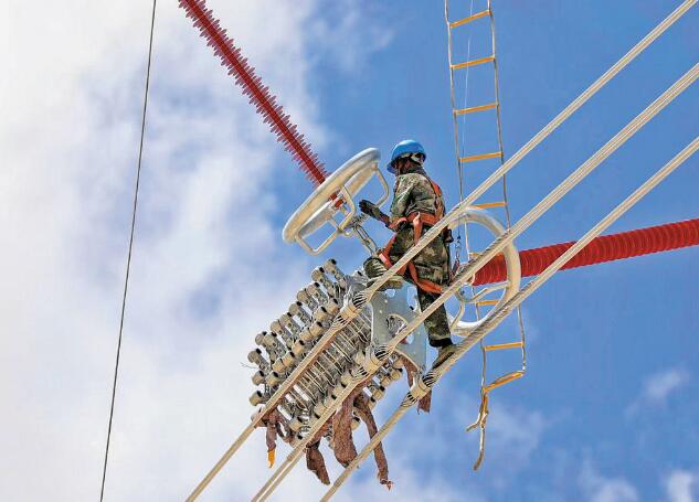 黨員在750千伏青海郭隆—甘肅武勝第三回線路工程(青海段)安裝附件?! ∴u建華 攝
