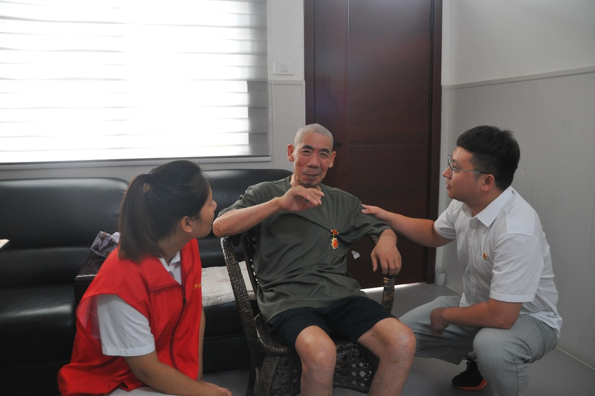 活動中,在看望98歲高齡的抗戰(zhàn)老兵李位發(fā)和60歲老人宋洪彥時,志愿者給老人送上了精心準(zhǔn)備的慰問品,和老人促膝交談,對其為國家所作出的貢獻(xiàn)表示感謝。老人向大家講述自己參加抗美援朝戰(zhàn)爭和中越邊境自衛(wèi)反擊戰(zhàn)時的經(jīng)歷。志愿者還詳細(xì)詢問了老人的身體健康情況,并叮囑老人要保重身體,祝愿老人健康長壽。