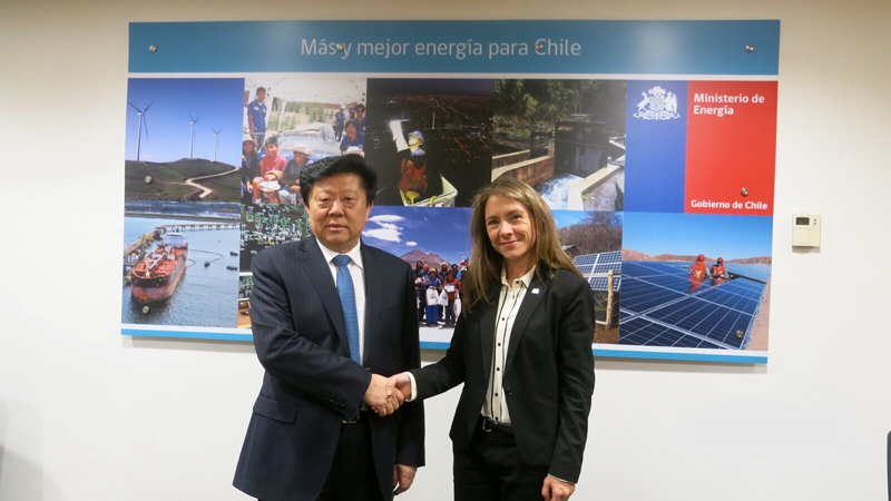 5月24日,南方電網(wǎng)公司黨組書(shū)記、董事長(zhǎng)李慶奎拜會(huì)智利能源部長(zhǎng)吉梅尼茲女士。(姜雨彤 攝)