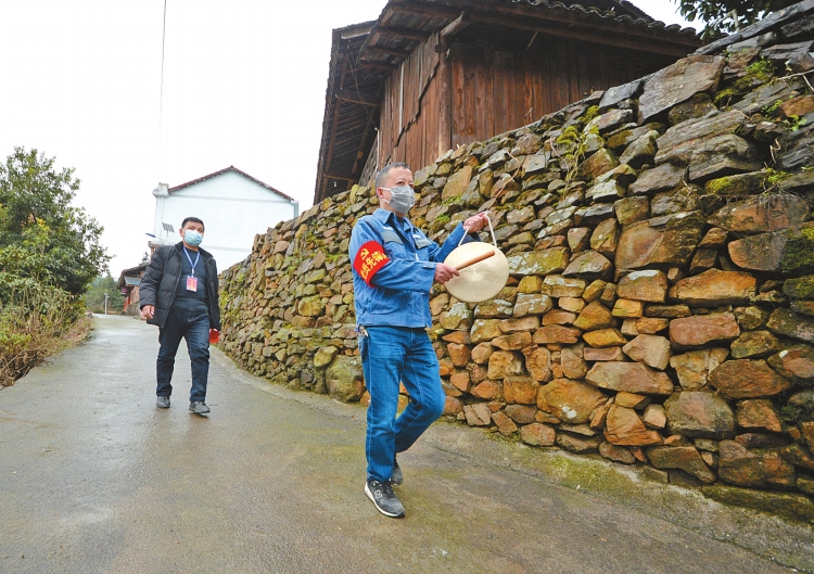 2月5日,貴州省黔東南苗族侗族自治州三穗縣八弓鎮(zhèn)高寨村響洞寨,貴州電網(wǎng)公司凱里三穗供電局駐高寨村幫扶干部羅德杰(右一)和村委干部一同,一個(gè)負(fù)責(zé)敲鑼,一個(gè)負(fù)責(zé)提著播放器,穿梭于寨子里,向村民宣傳防疫知識。 萬明忠 攝