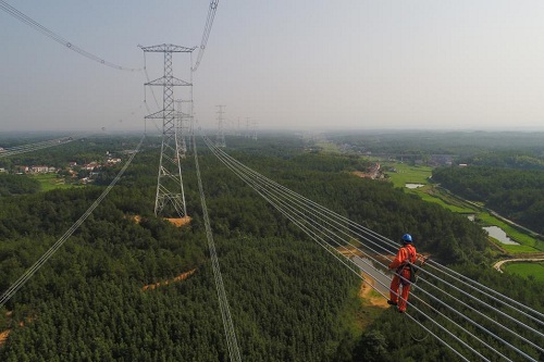國(guó)網(wǎng)陜西電力員工在南陽—荊門—長(zhǎng)沙1000千伏特高壓工程線路安裝間隔棒。
