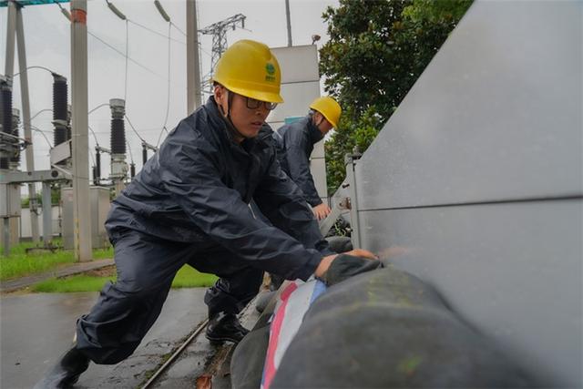 國網(wǎng)安徽安慶岳西縣供電公司員工裝沙袋加固城西變電站圍墻,防范臺風(fēng)影響變電站設(shè)備安全運行。