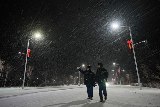 國(guó)網(wǎng)蒙東電力員工對(duì)保暖涉及配電線路進(jìn)行夜巡。