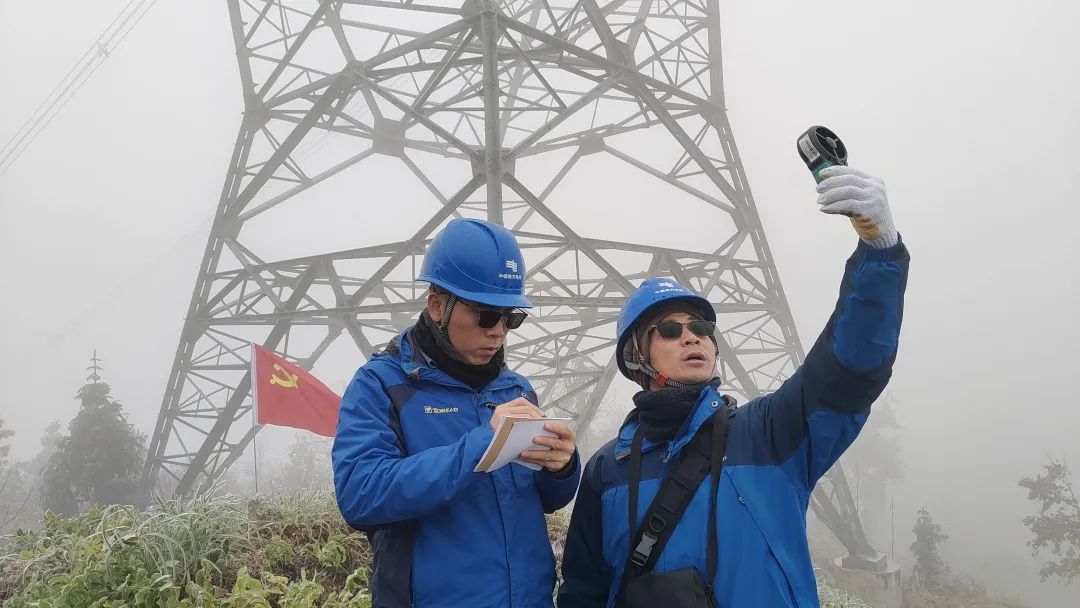 南方電網(wǎng)超高壓公司柳州局黨員突擊隊在500千伏線路所在地測量風(fēng)速、濕度,量冰厚、觀冰情。(焦偉軍 攝)