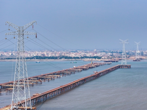 為最大程度上減小對(duì)海洋生態(tài)環(huán)境的影響,國(guó)家電網(wǎng)公司采用透水性構(gòu)筑物施工方式,在海上搭設(shè)4.7萬平方米的棧橋通道,棧橋搭設(shè)鋼材使用量超過了5.6萬噸,為國(guó)內(nèi)在建電力工程規(guī)模最大的海上棧橋。