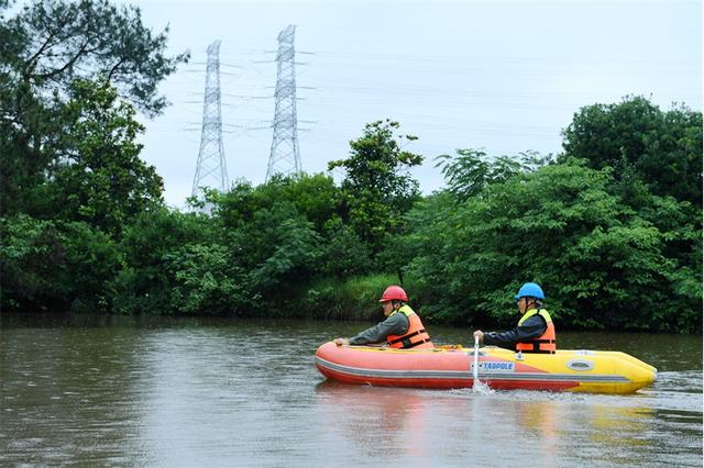 國網(wǎng)浙江金華供電公司員工利用皮劃艇對池塘溪澗附近10千伏線路開展防汛隱患排查。