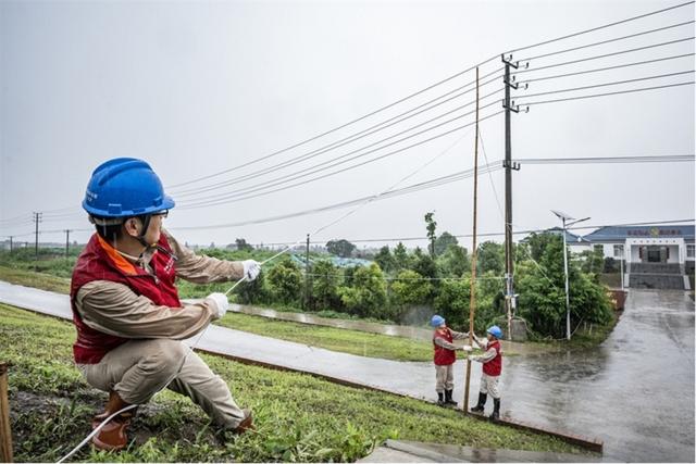 國網(wǎng)浙江衢州供電公司員工在林山鄉(xiāng)霞湖村冒雨搶修受損線路。